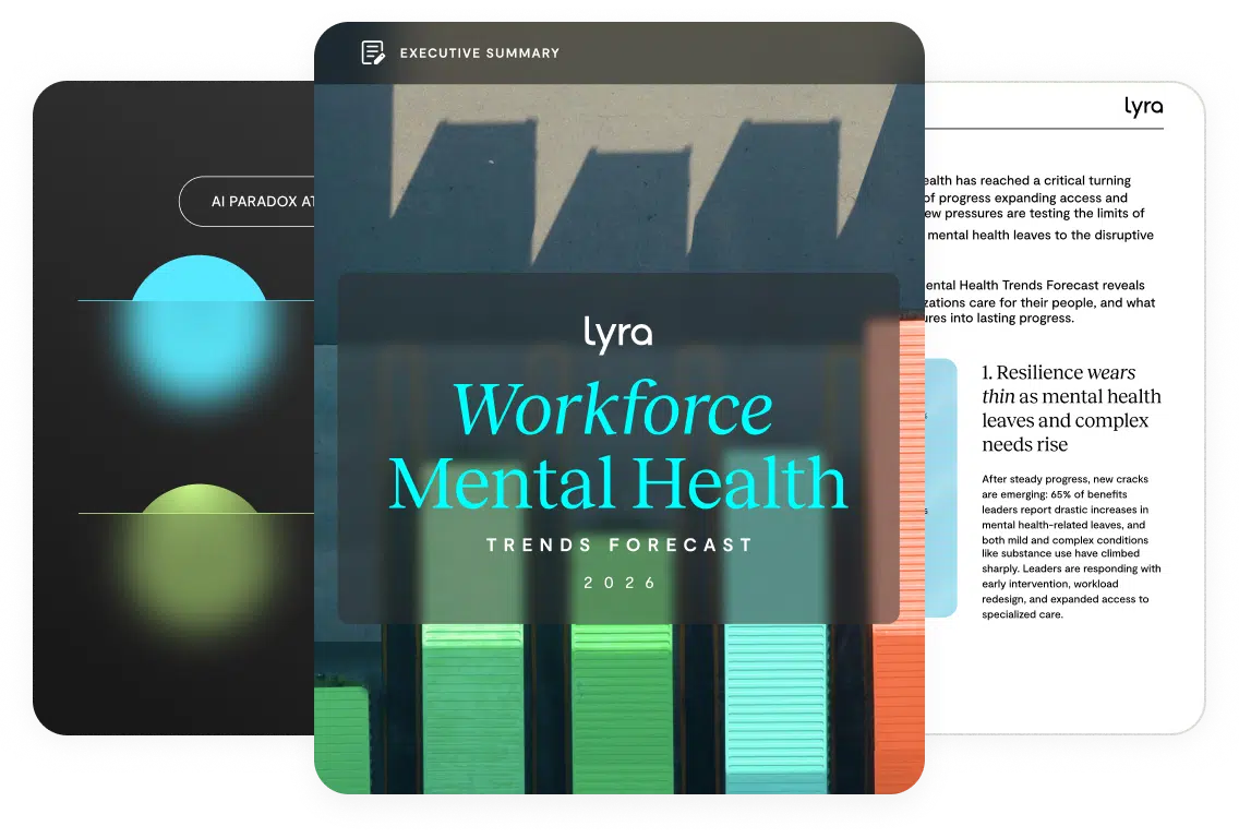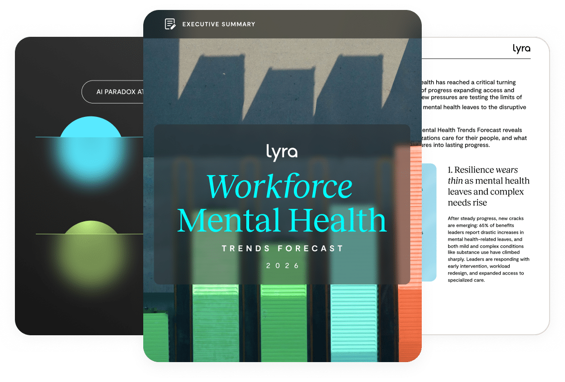 This executive summary of Lyra’s 2026 Workforce Mental Health Trends Forecast, based on insights from 500 HR and benefits leaders, reveals the six forces reshaping how organizations care for their people—and what it will take to turn today’s pressures into lasting progress..