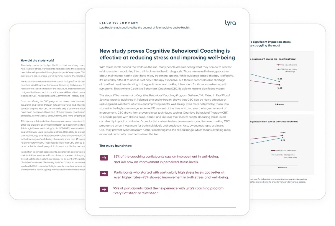 The study, Blended CBT intervention for depression and anxiety in real world settings: an effectiveness study, published in the Journal of Medical and Internet Research, shows that Lyra Blended Care Therapy helps individuals with depression and anxiety experience significant decreases in symptoms in a shorter period of time. This enhanced teletherapy program combines live video therapy with online Cognitive Behavioral Therapy (CBT)-based lessons.