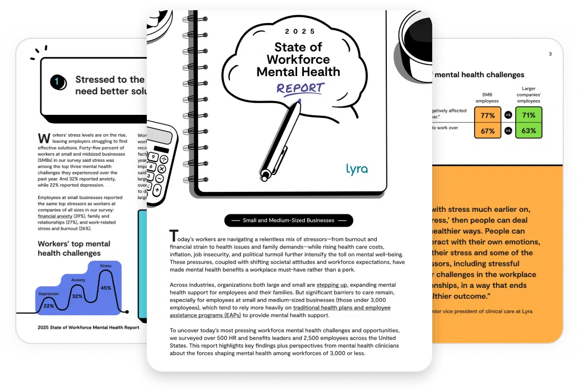Lyra’s State of Workforce Mental Health Report shares insights from 500+ HR leaders and 2,500 employees, plus expert clinician perspectives on key forces shaping workforce mental health in 2025—for businesses with 3,000 or fewer employees.
