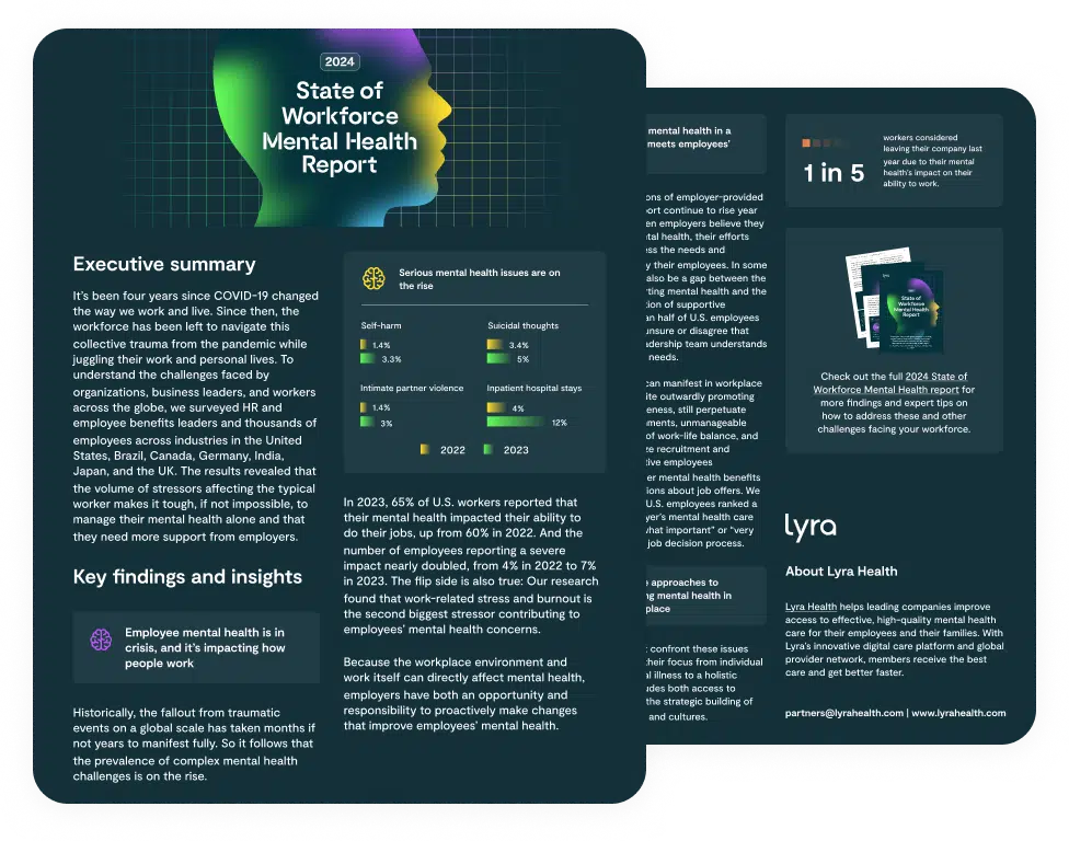 This summary offers an overview of Lyra Health’s fourth annual State of Workforce Mental Health Report, where we surveyed employee benefits leaders and thousands of employees to understand where employers should be focusing their attention to better support workforce mental health.