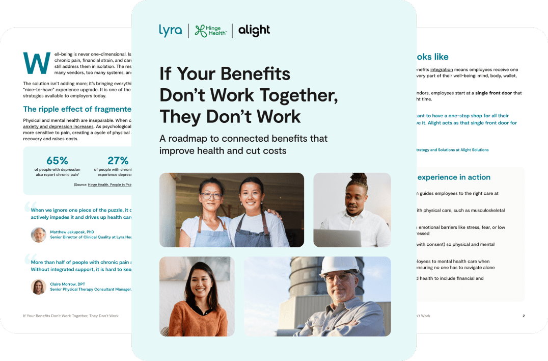 Disconnected benefits drain budgets and frustrate employees. Learn how Lyra, Alight, and Hinge Health unify care across physical, mental, and financial health for better outcomes and real savings.