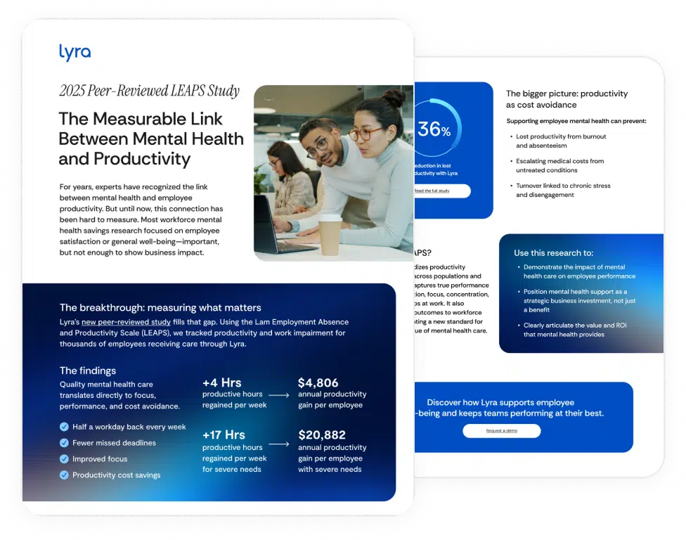 Workforce mental health impact has been hard to quantify. Lyra’s new peer-reviewed study changes that by using the Lam Employment Absence and Productivity Scale (LEAPS) to measure productivity and work impairment at scale. The results demonstrate a critical link between mental health care, workforce performance, and ROI.