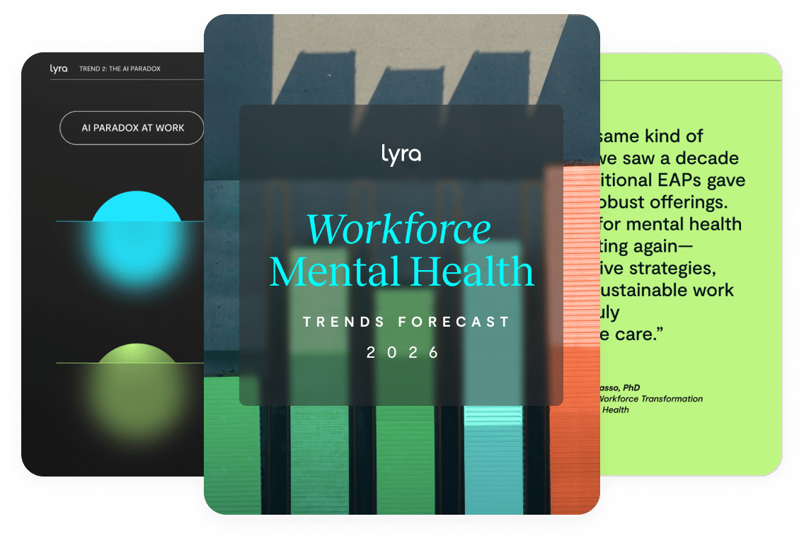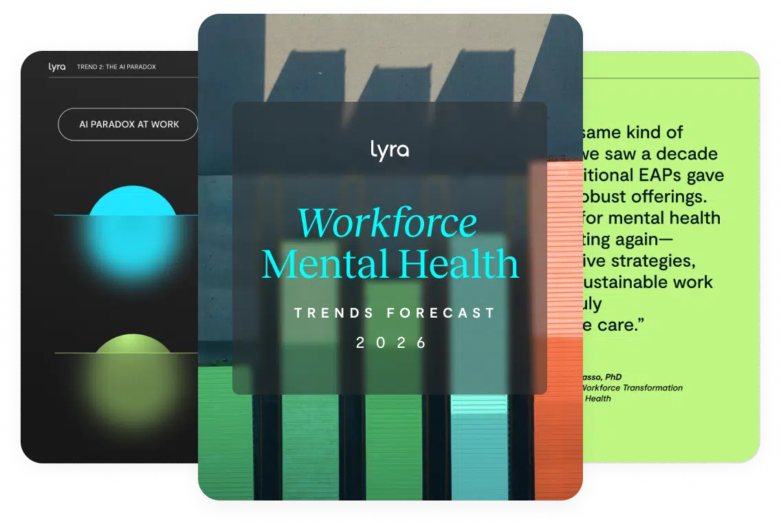 Lyra’s annual Workforce Mental Health Trends Forecast offers a roadmap for what’s next. Backed by insights from more than 500 HR and benefits leaders, this year’s report reveals how employers can turn disruption into opportunity. Read the report to find out: