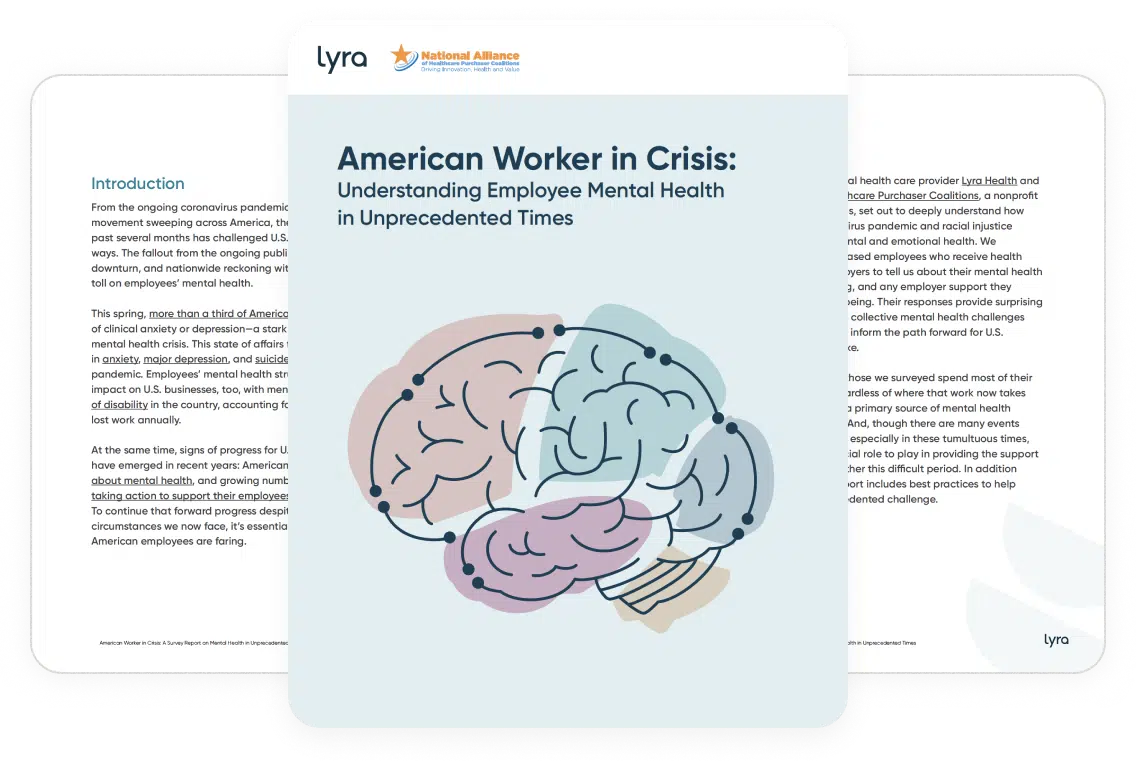 From the ongoing coronavirus pandemic to the racial justice movement sweeping across America, the uncertainty and upheaval of the past several months has challenged American workers in unparalleled ways. Lyra Health, in partnership with the National Alliance of Healthcare Purchaser Coalitions, wanted to better understand how the public health crisis, economic downturn, and nationwide reckoning with racism is affecting employees’ mental health. To accomplish this, we surveyed more than 1,200 full-time U.S. employees about the symptoms they’re experiencing, how they’re coping, and any support they’re receiving from their employers for their mental health.